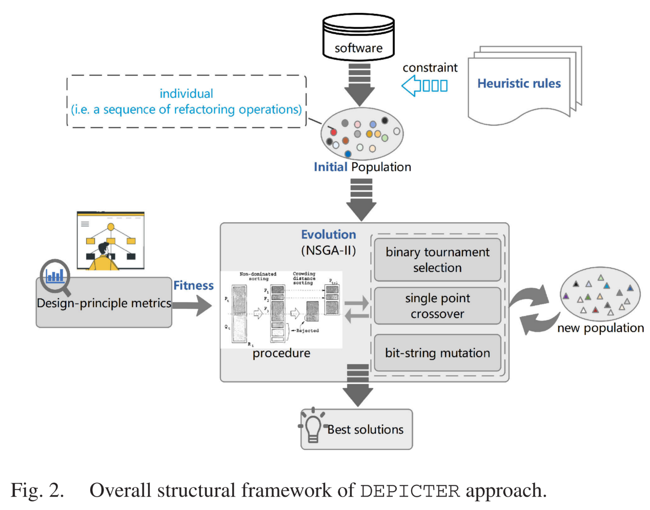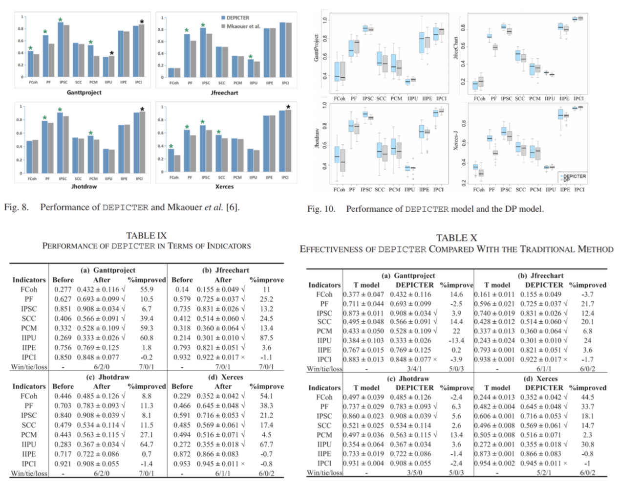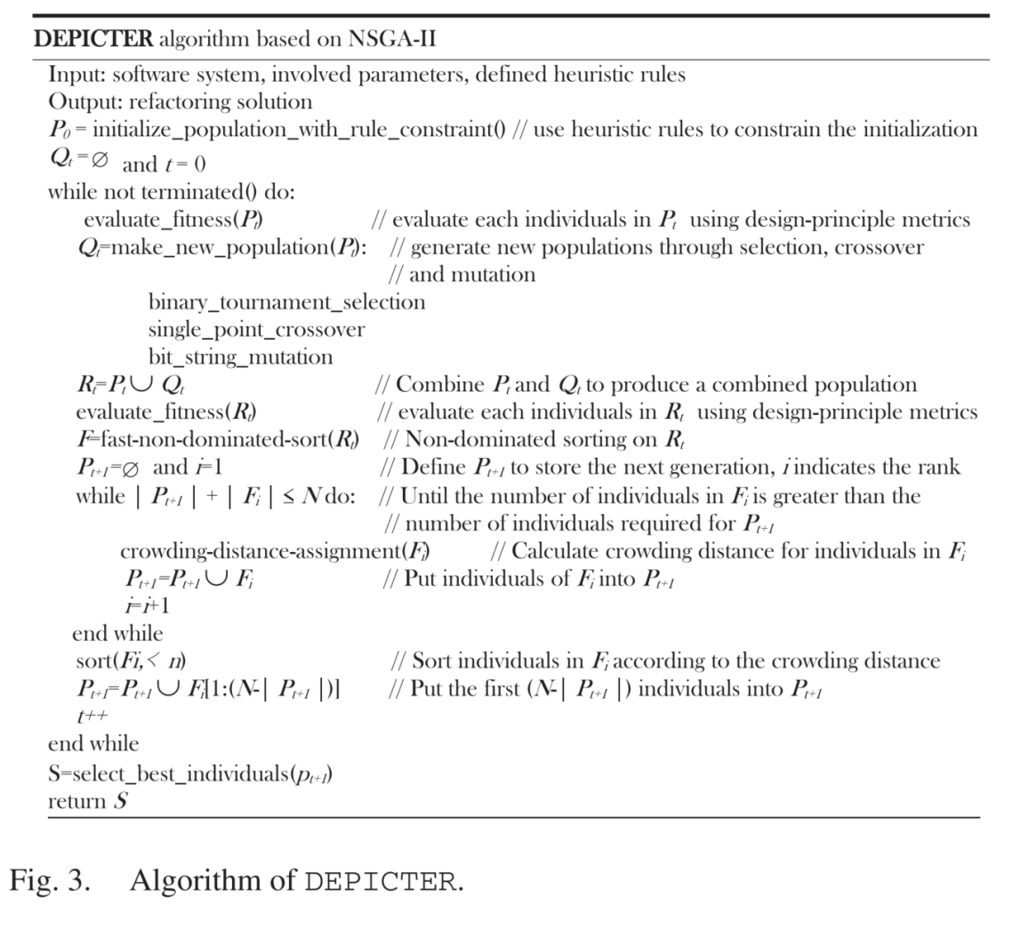 DEPICTER使用非支配排序遗传算法(NSGA)-II 遗传算法,采用设计原则度量作为适应度函数,并利用启发式规则来提高初始种群的质量,以进行后续的通用进化。基于四个开源的软件系统的评估表明,1)DEPICTER可以有效地提高软件设计质量和符合设计原则的程度,并且从开发人员的角度来具有一定的实用性。2)DEPICTER的表现优于现有的重构方法和使用最广泛目标的常见方法。3)使用设计原则指标作为适应函数可以显著提高重构的有效性,并且与传统指标相比,定义的启发式规则对DEPICTER的推荐结果有积极的影响。以上结果对于指导实践中更好的重构模型的发展具有重要意义。