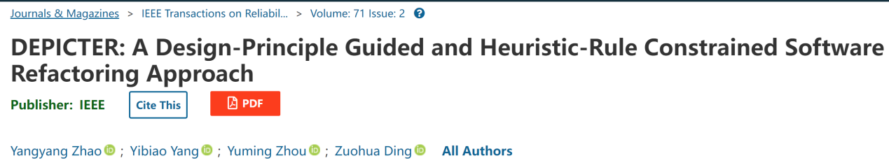 计算机科学与技术学院丁佐华教授团队,在软件重构领域取得了新进展。该研究成果于2022年6月发表在国际重要刊物《IEEE TRANSACTIONS ON RELIABILITY》上。