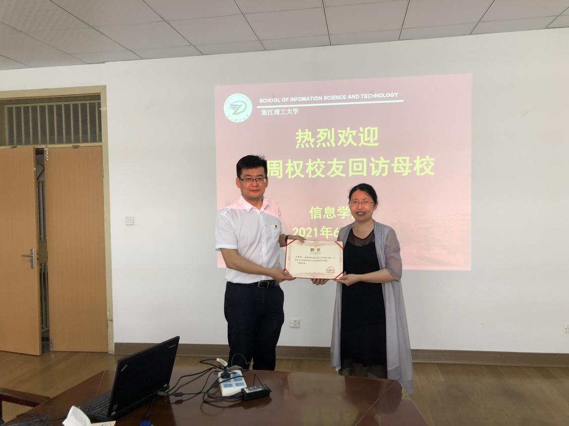 党课开始前,学院党委书记黄黎、党委副书记包新春在10-315会议室与丁周权校友一起座谈,并聘请校友为我校校友导师。