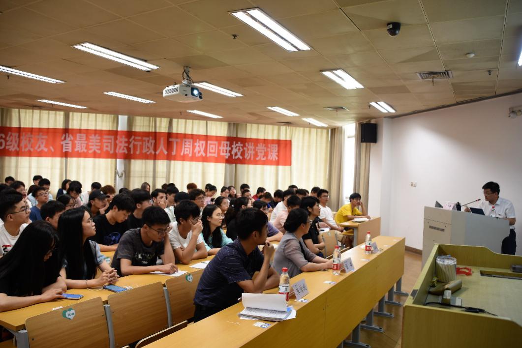 丁周权校友回忆了当年在学校生活的点滴经历,尤其是入党时的深刻记忆。接着,他结合古今中外的生动案例和自己的工作经历,深入浅出、幽默风趣地和同学们分享了从毕业找工作到消防员再到司法局的人生历程,阐述了个人对“四个自信”的理解。他强调,文化自信是基础,是更广泛、更深厚的自信,大学生要坚定“四个自信”,把握正确的前进方向。然后,丁周权分享了工作21年以来的心得体会:要提前做好人生规划;人生要懂得选择(选择适合自己的工作、导师、爱人、圈子);参加工作后要多学习、肯吃苦、懂得换位思考;要善良。