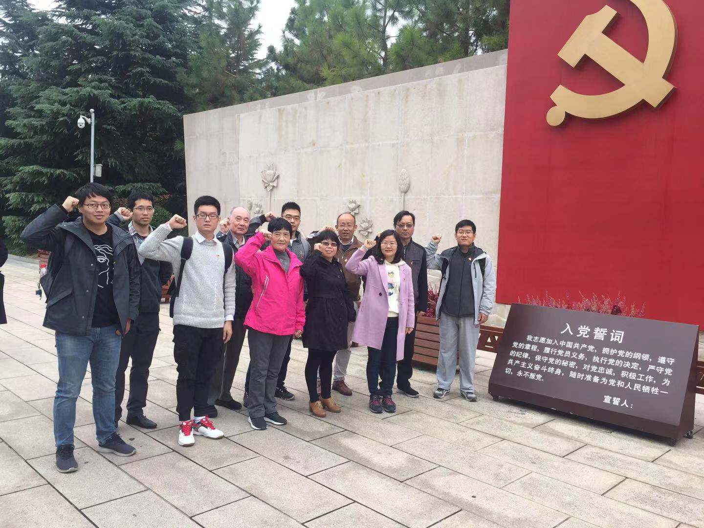 在纪念馆北广场,通信工程教工支部以及党员家属面对党旗和入党誓词,整肃队伍,握拳举手,庄严宣誓入党誓词。誓言声声、铿锵有力,我们在重温入党誓词的同时,更加坚定了对党热爱、忠诚的信念。