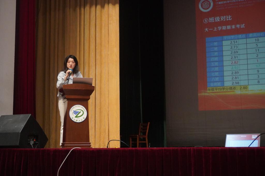 会议伊始,辅导员周天姝进行了学业成绩分析,详细解读了2022级学生成绩的整体情况,以及各个年级同期成绩分布。她提醒同学们要正确认识自己的学业成绩,合理安排学习计划,并指出了现存问题,列举了应对措施。