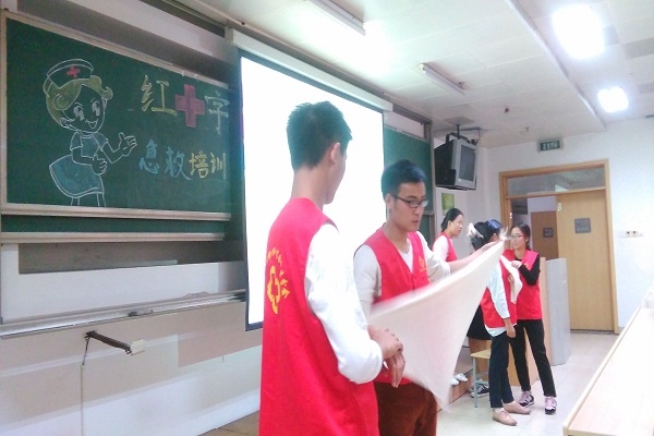 11月7日下午,信息学院“红十字”急救培训于2N119教室准时开始。活动伊始,用《真正男子汉》中一段视频起兴,其内容便是本次急救培训的主要内容——三角巾包扎法。仅急救工具而言“三角巾”是一种用途十分广泛的工具,正如“红十字会”部长李静凡所说:“三角巾操作简单,使用方便,容易掌握,包扎面积大,是为首选”。