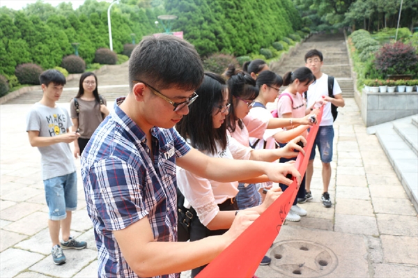 到达革命烈士纪念馆后,与馆内负责人员进行必要的交涉。很快就开始展开各项工作,此次活动的主旨是加强大学生理想信念教育和爱国主义教育,让传承时代精神的理念播种在每个人的心中。首先我们就馆内的游客发放宣传“红船精神”的单页,并借此向他们讲述我们对“红船精神”的理解,以及我们此次活动的目的,希望能引起他们对革命历史的关注。在进行了单页的宣传之后,小分队的成员拉起了横幅,向来参观的游客宣传我们的口号,希望他们能加入我们,以红色的条幅连起我们共同的期望——革命精神永垂青史,永留民族血液之中。因为来参观的居多是高中生,活动得到了他们的积极响应,顺利地完成。等到活动结束之后,小分队成员自发的来到英雄纪念碑前肃立缅怀,感受这烈士安息之所的庄严,体会革命先驱赴死的悲壮。我们虽然生活在和平幸福的年代,但是我们不能忘记战争年代的艰难岁月,不能忘记流血牺牲的烈士英豪。静思之中,烈日已西下,我们也结束了一天的实践活动体验。