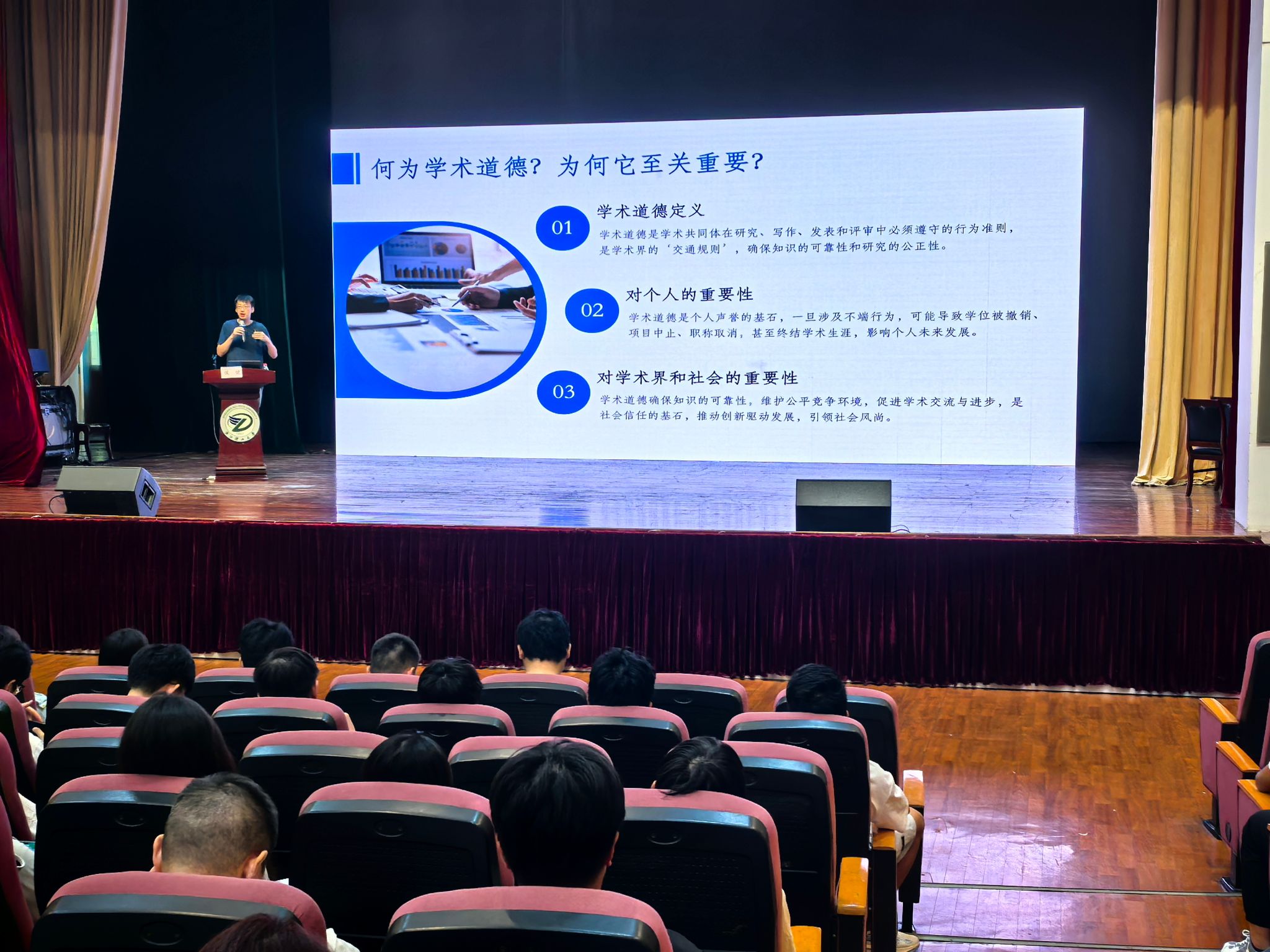 邀请校内外专家做学术讲座,帮助同学们进一步理解和深化学术诚信,树立在AI时代浪潮下坚守学术诚信、筑牢学术诚信防线底线,从而营造风清气正的学术环境。
