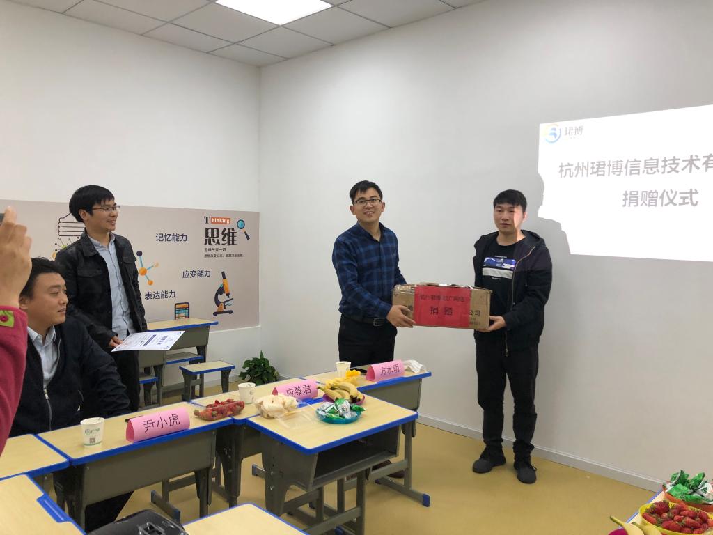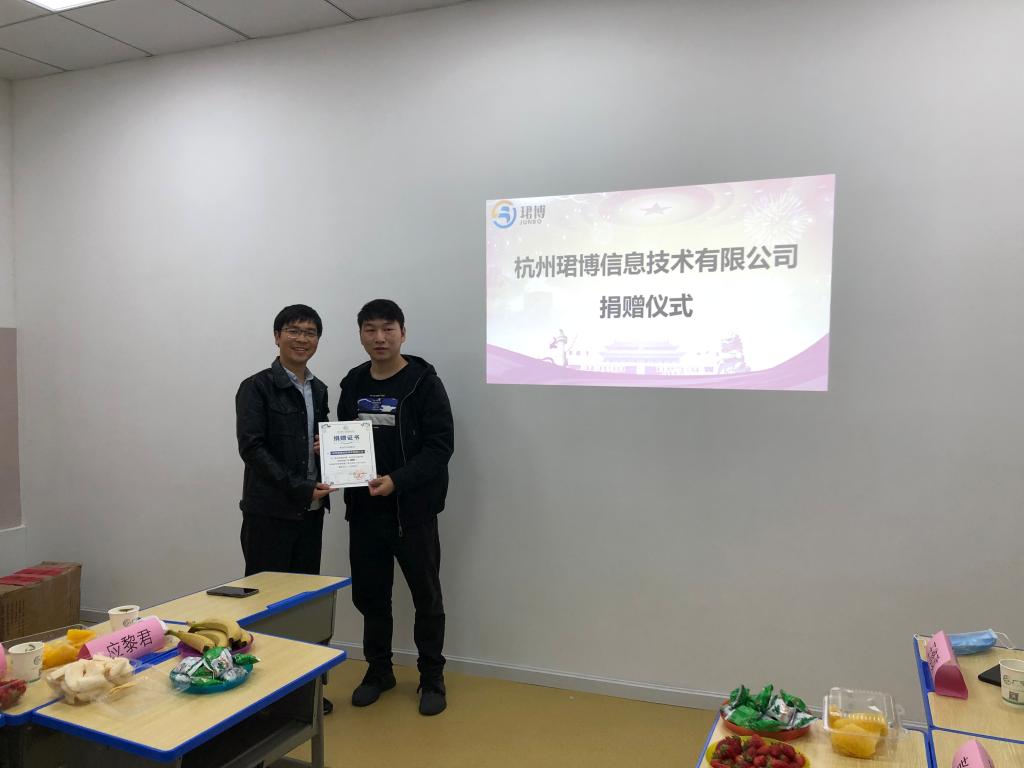 3月25日下午,校友企业助力学院复工复学捐赠仪式在杭州珺博信息技术有限公司广学教育分部举行,我院2019届计算机技术专业研究生校友、杭州珺博信息技术有限公司总经理彭轻羽,学校校友工作办公室副主任应黎君,学院党委副书记方水明,学院团委书记、校友联络服务中心主任尹小虎参加了捐赠仪式。在学校和校友企业各部门负责人共同见证下,校友企业向学院捐赠了1000个防疫口罩。