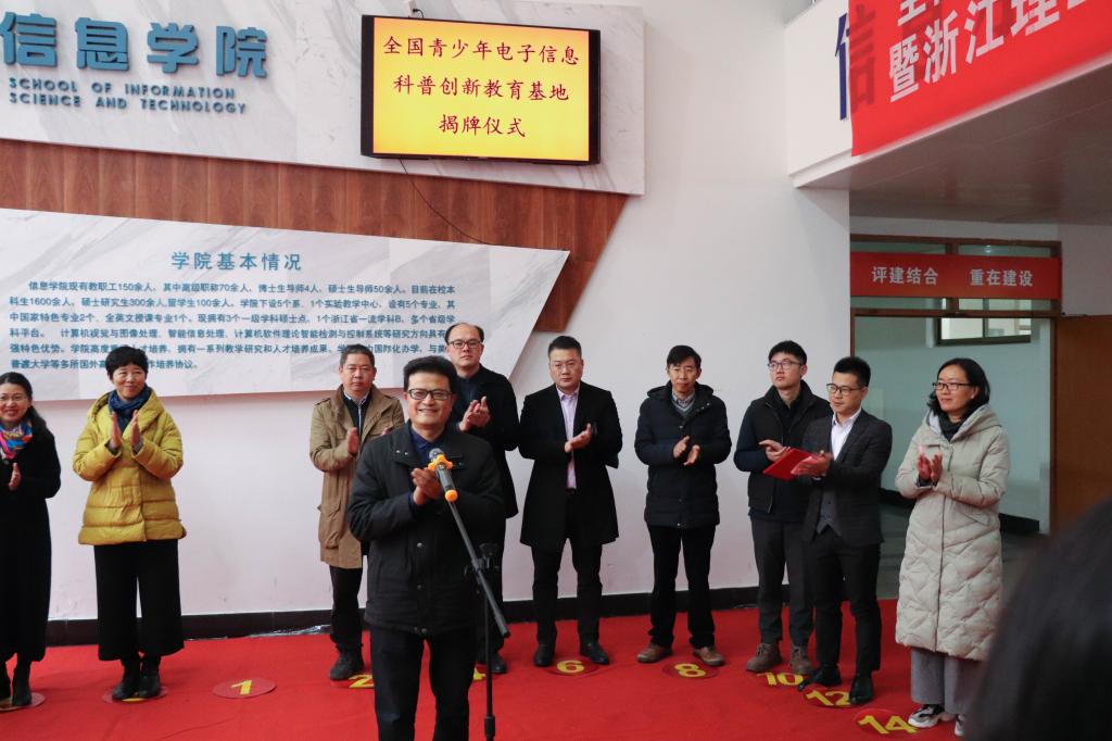 12月18日下午,全国青少年电子信息科普创新教育基地揭牌仪式在我院一楼大厅举行。校党委副书记陶伟华出席仪式,浙江省机器人协会会长俞晴,钱塘新区管委会经发科技局副调研员田焕荣,校党委学工部、校招生与就业处、校友办、校团委、信息学院相关负责人,杭州泽高机器人科技有限公司、杭州欧优机器人科技有限公司等企业的代表,以及基地志愿者、学生代表等百余人参加了此次揭牌仪式。