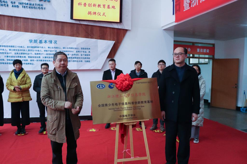 副院长姚青宣读了中国电子学会的基地批复文件。俞晴和校党委学工部部长胡琦为“全国青少年电子信息科普创新教育基地”揭牌。校团委书记吕媛媛为“全国青少年电子信息科普创新教育基地志愿服务队”队长颁发聘书。