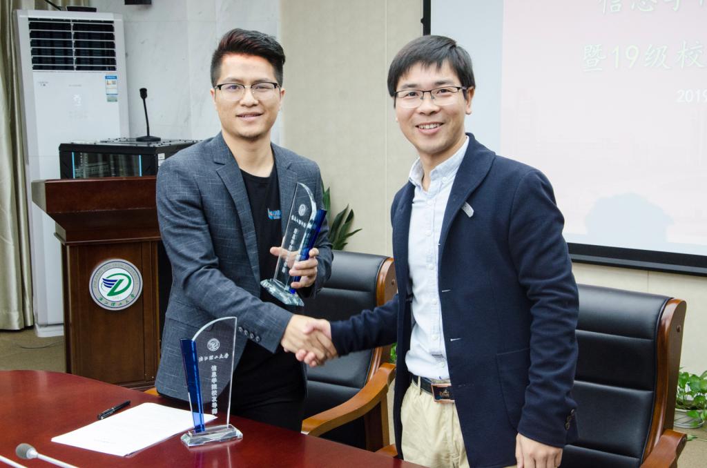 尹小虎介绍了19级校友导师班级对接情况,蒋明峰和方水明为19级校友导师颁发聘书和纪念奖杯。随后,校友导师们上台进行了简短的自我介绍并发表感悟。各班负责人带领对应的校友导师在教室开展第一次校友导师见面会,让在校生和各自班级的校友导师互相了解。