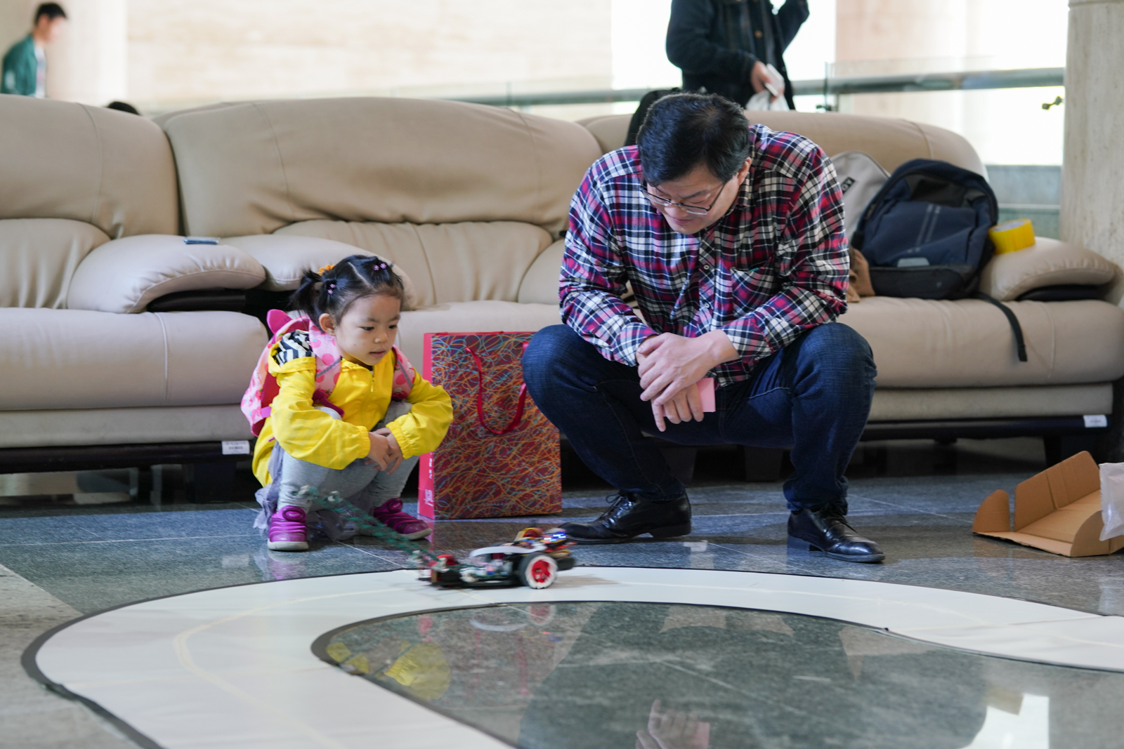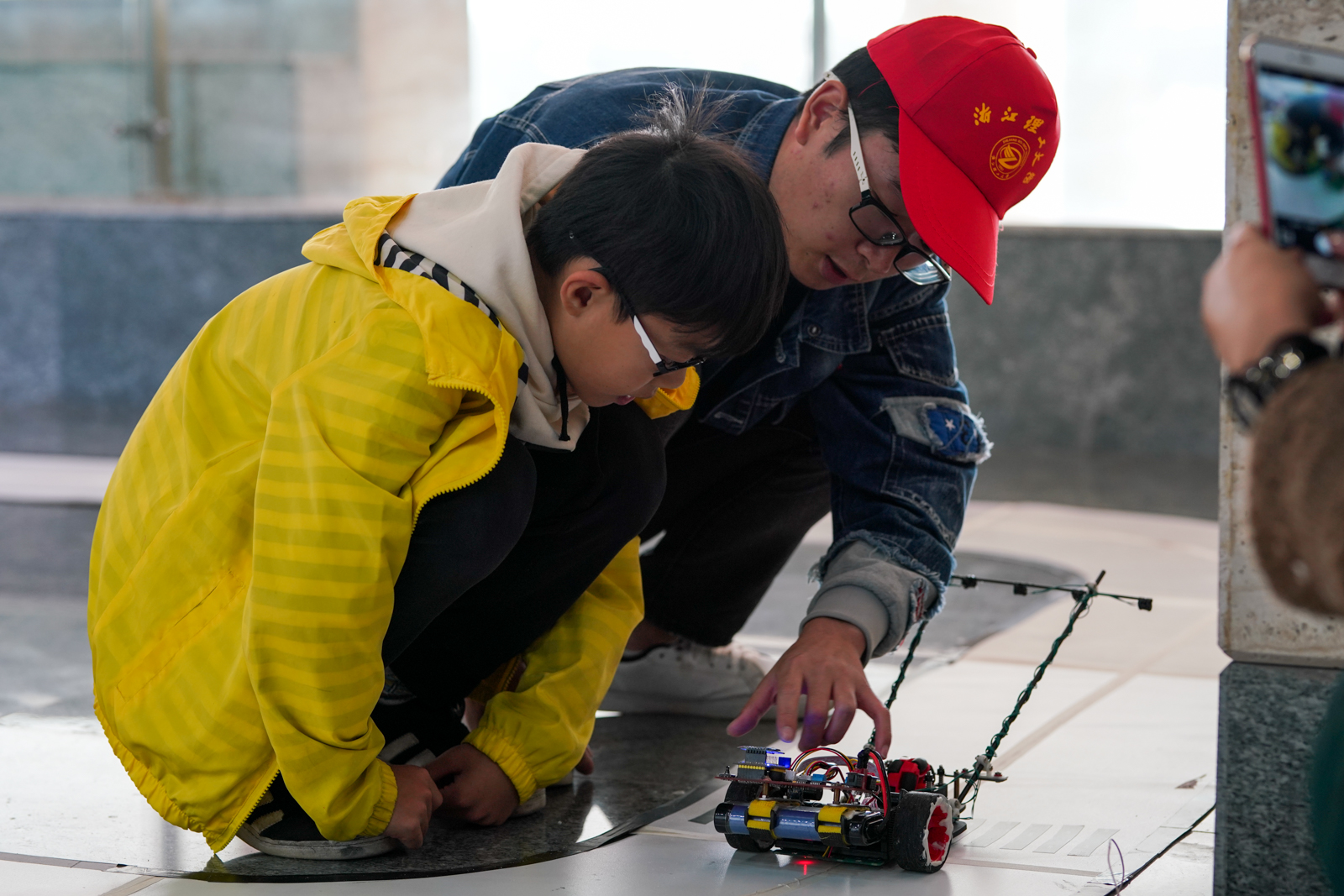 在表演过后,旁边的小孩子都纷纷上前想要亲自尝试,校友们在亲自体验时,我们也对在旁的团队成员,大四学长张行建进行了采访。他告诉我们,小车主要是由电子编程来实现自控的,操控的信号是由轨道中的线来发送,根据信号,小车就能通过事先编译的程序进行各种运行操作。当谈到为什么会学习这个专业,他则笑着说这是源于自己童年的梦想,因为小时候特别想拥有个能自控的小车,所以在后来的学习生涯里,就慢慢的向这个方向靠了过来,就算通宵熬夜,只要想到最后的成品,所有的辛苦就都是值得的。为了普及此类知识,他想到用智能小车的亲子活动方式来进行,一方面让同样有着此类兴趣的小朋友们有个梦想的雏形,一方面也能为学校的校庆能在孩子群体里得到更多的关注。