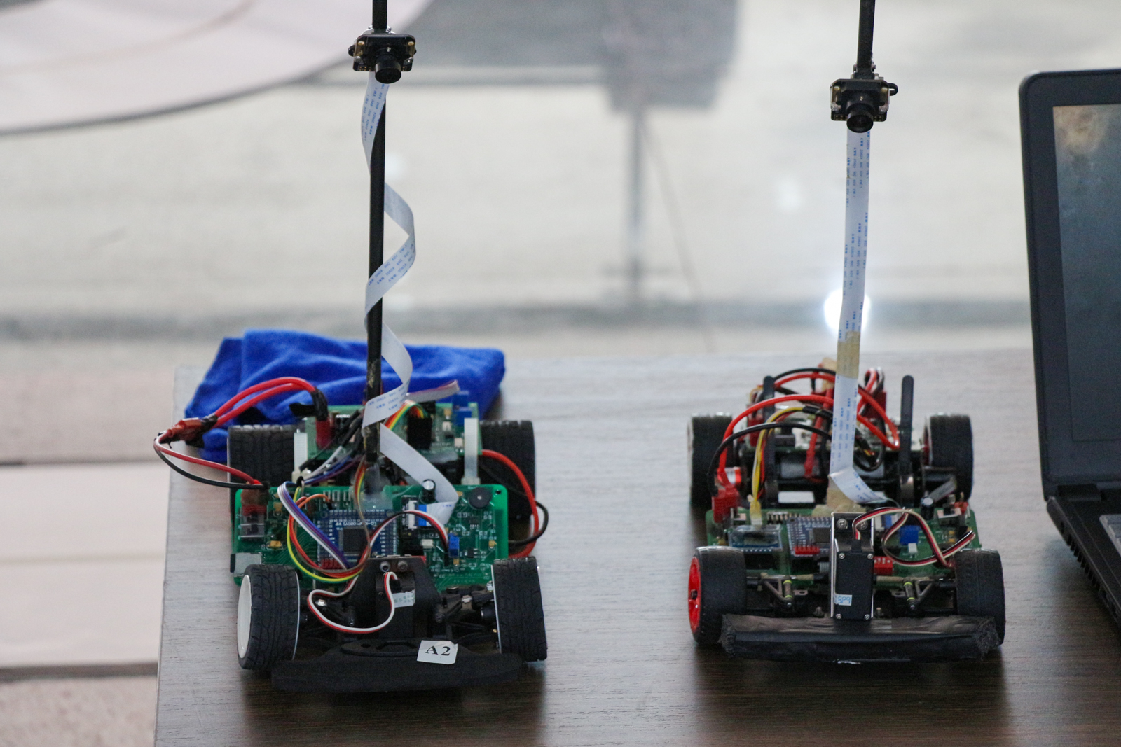 提及智能小车,我们常常会想起幼时的玩具赛车。智能小车的特殊点据在此次负责人所说,这里的小车,不需要遥控,不需要昂贵的轨道模型,只需要一条长长的小线和长条布,就能让小车沿着你所摆放的线路自动行驶,只要小车还有电,那么它就能一直按轨道跑下去。随后的现场的试验也完美的验证了他的话。行驶的小车仿佛有一只魔手在操控它,直道加速,到了拐弯口时它又能巧妙的降速变向,特别在拐弯时的那一刹那,因为自身的惯性,小车的左轮往往都会压在了线上,几乎快滑出轨道时,它却又能奇迹般的重新冲回轨道。旁边的小孩们都被这奇妙的小车牢牢吸住了视线,身旁的家长和在校生们也都目不转睛,很多人嘴巴都一张一合,遗憾的惊呼刚涌到喉咙,吐出来的却生生转化成了惊叹。