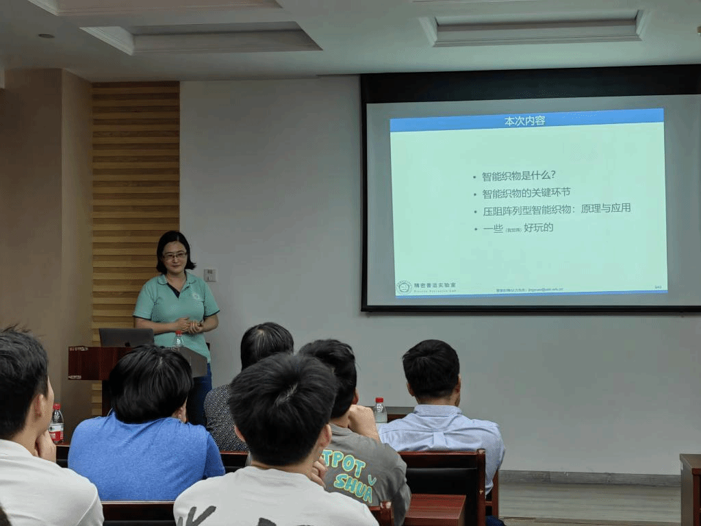 本次讲座程敬原教授讲述了智能织物的发展历史和趋势,介绍了织物构建、电子学驱动、信息提取算法与应用。压阻阵列型智能织物是一种基于柔性聚合物薄膜材料制备的高灵敏可穿戴传感器件,该器件由多个压阻薄膜材料复合而成,具有高灵敏度、快速响应性、高稳定性和长寿命等优点,在柔性可穿戴电子领域具有广阔的应用前景。