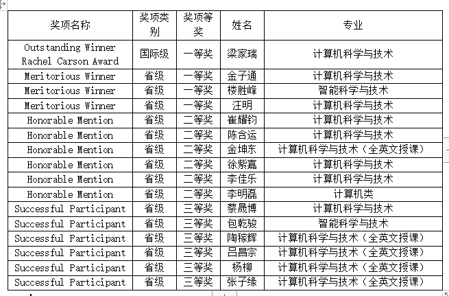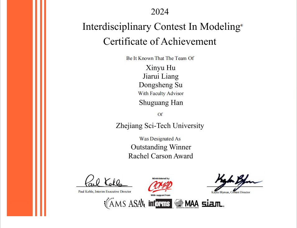 近日,2024年美国大学生数学建模竞赛(MCM/ICM)成绩正式揭晓,计算机科学与技术学院(人工智能学院)参赛学生发挥出色,16人摘得奖项。1人获得国际赛特等奖(Outstanding)、1人获得单项奖“Rachel Carson Award”、3人获得一等奖(Meritorious Winners)、6人获得二等奖(Honorable Mention),6人获得三等奖(Successful Participant)。