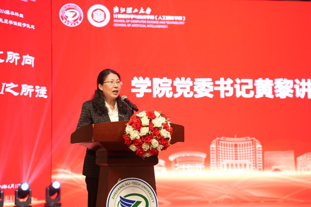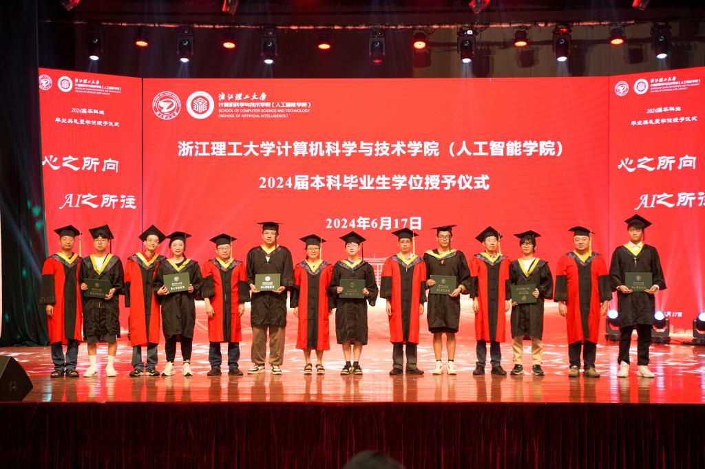 6月17日上午,计算机科学与技术学院(人工智能学院)2024届本科生毕业典礼暨学位授予仪式在下沙校区学生活动中心小剧院举行。学院党委书记黄黎,学院副院长姚青、蒋明峰,学院党委副书记、纪委书记丁宁,计算机科学与技术系主任沈炜,数字媒体技术系主任舒挺,智能科学与技术系主任张海翔,本科学位委员会成员丁佐华、喻擎苍,学院办公室主任关静,学院团委书记、学工办主任朱诗威,毕业班班主任、辅导员以及家长代表出席典礼,2024届全体本科毕业生参加。典礼由丁宁主持。