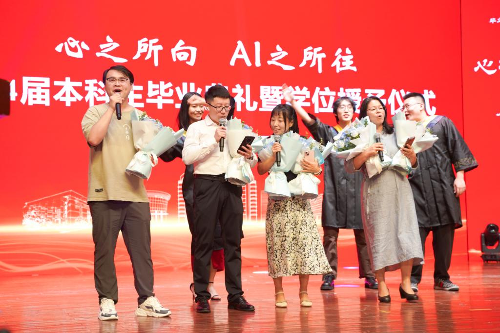 毕业典礼结束后,2024届计算机科学与技术学院(人工智能学院)学士学位授予仪式正式开始,学院本科学位委员会姚青、蒋明峰、丁佐华、喻擎苍、沈炜、舒挺和张海翔等老师为全体本科毕业生颁发学士学位证书,扶正流苏并合影留念。