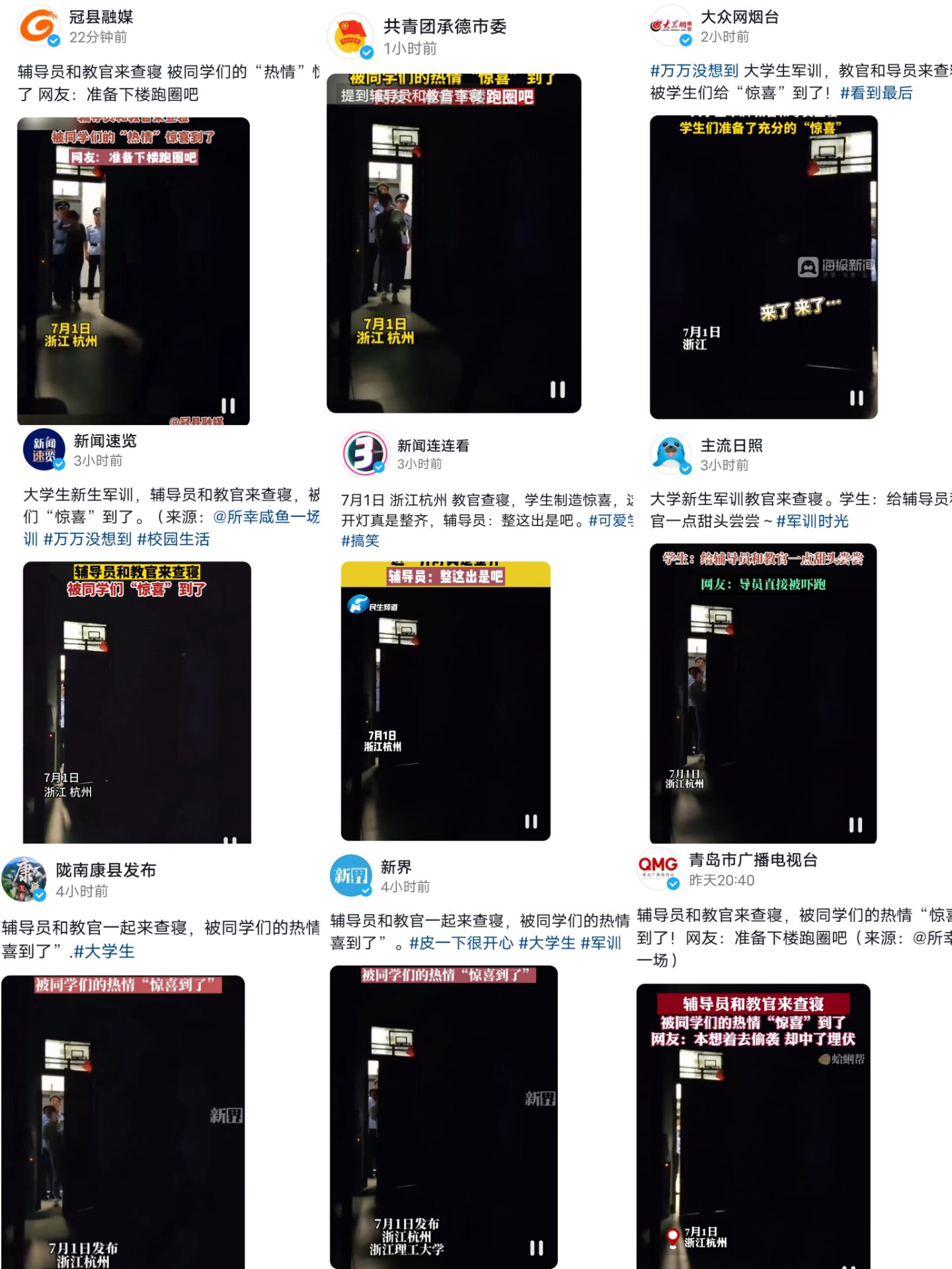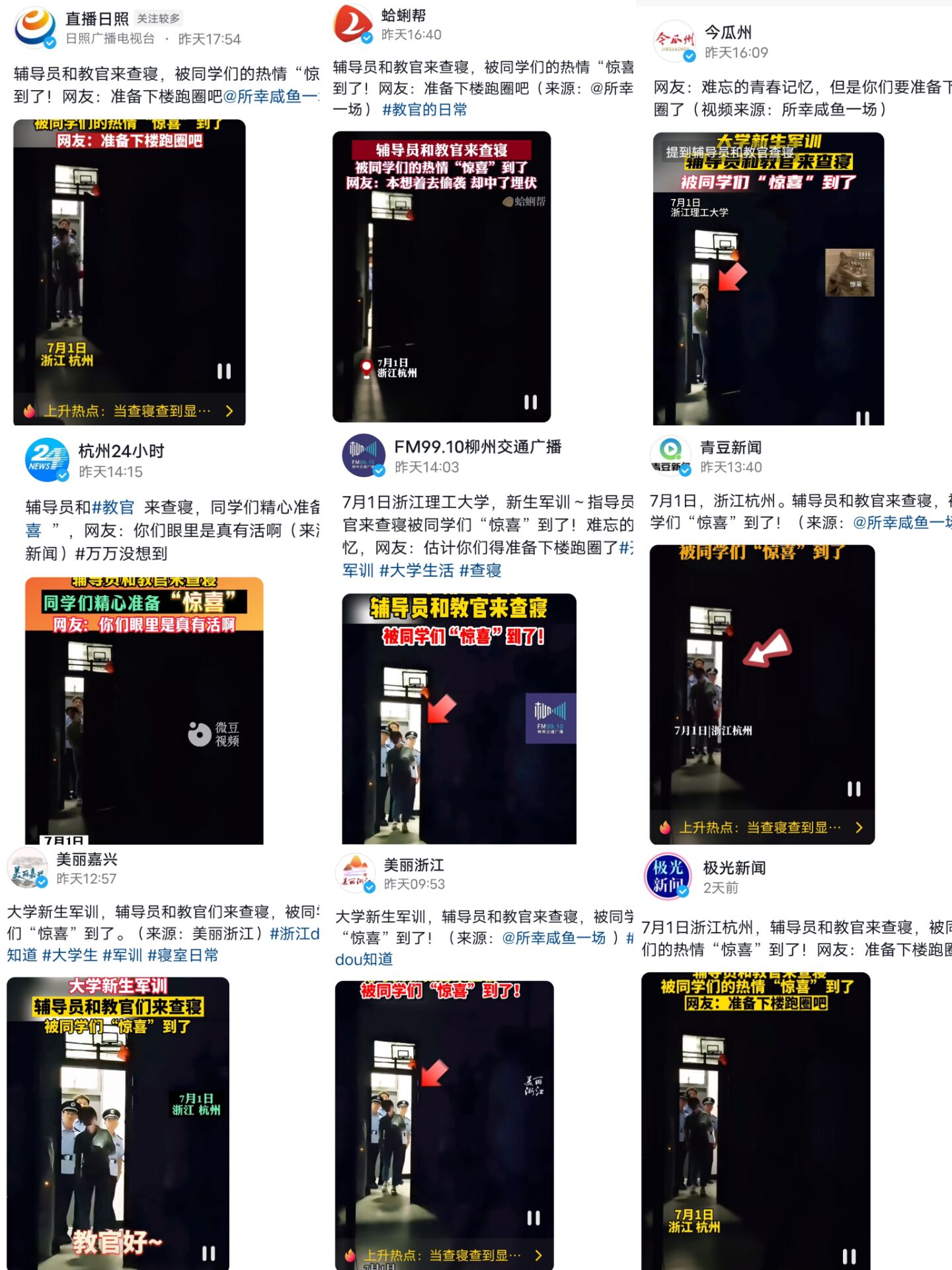 7月2日至7月4日,人民网、美丽浙江、杭州日报、新闻速览等23个抖音号报道我院周天姝老师军训查寝事迹。