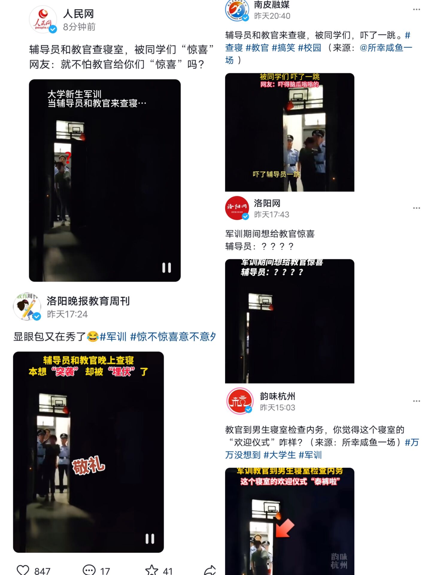 【人民网】、【美丽浙江】、【杭州日报】等多家抖音号报道我院周天姝老师军训查寝事迹