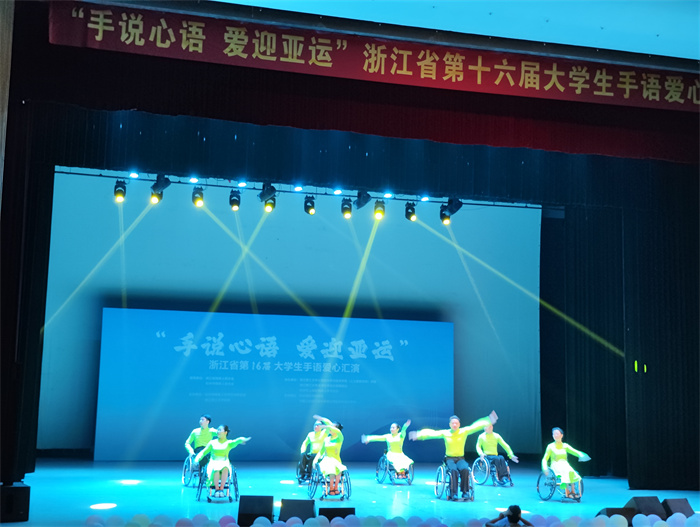 下午,残疾人文艺人士与大学生开展了热情洋溢的文艺交流,一同观看了“手说心语,爱迎亚运”浙江省第十六届大学生手语爱心汇演。来自多所在杭高校的手语社团,奉献了感动人心的精彩节目,展示了当代大学生对残疾人的关心关爱。残疾人轮椅舞蹈队表演的轮椅拉丁舞《逐梦》,舞动亚运,燃爆全场。